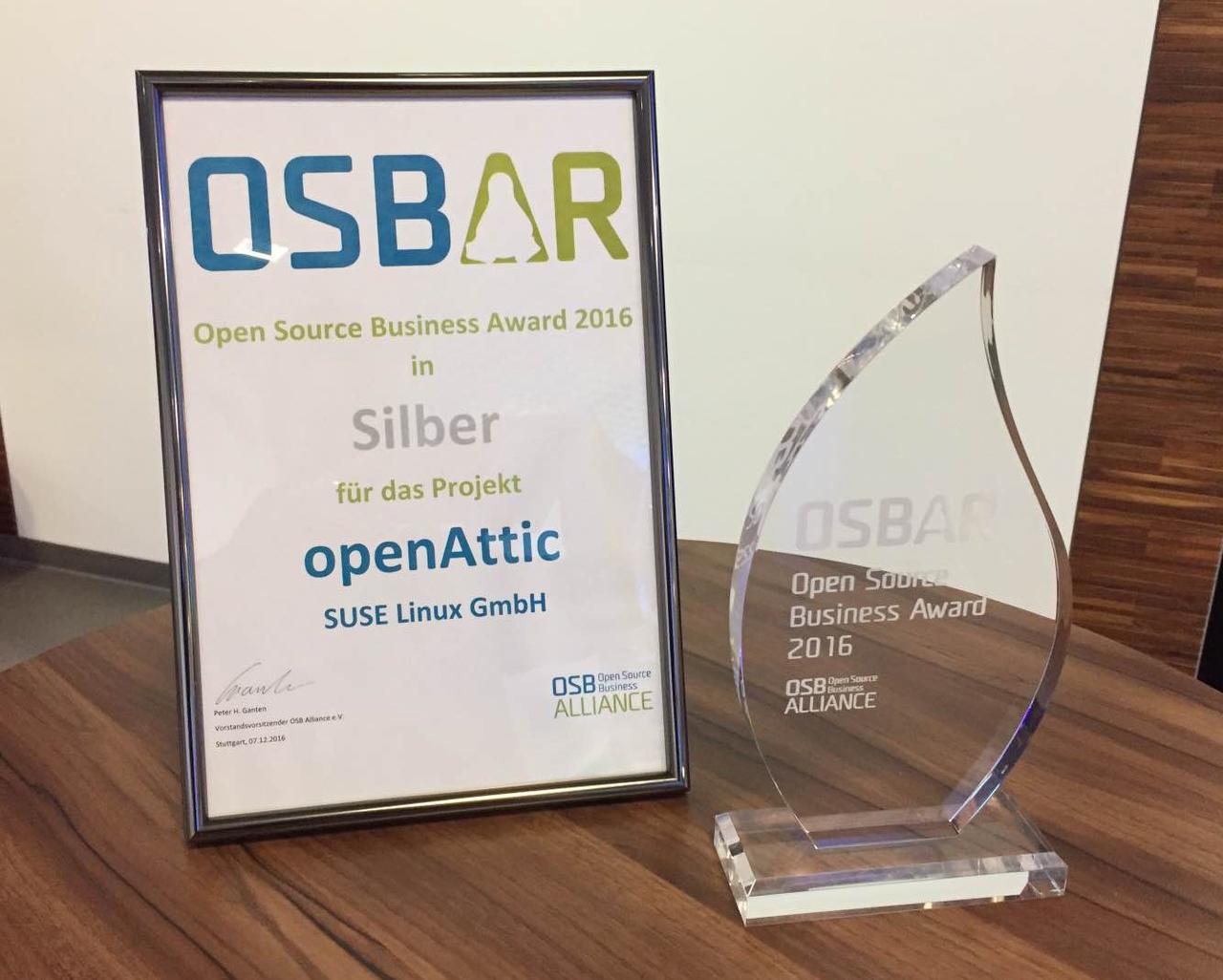 The OSBAR winners were awarded during the OPEN! 2016 event of OSB Alliance on December 7 in Stuttgart, Germany. Volker Theile from SUSE's openATTIC engineering team participated on our behalf and accepted the award.