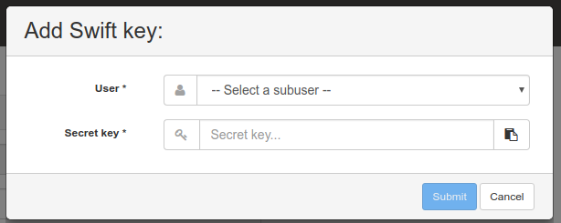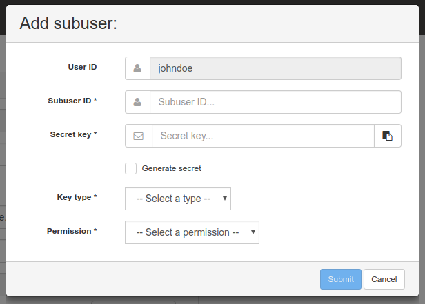 The web frontend work is performed by Volker Theile (OP-762). With this feature, you will be able to Add/Edit/Remove RGW users and subusers, as well as adding/editing their access keys and capabilities. There is no pull request for this part yet, please leave any feedback on the Jira issue for the time being.