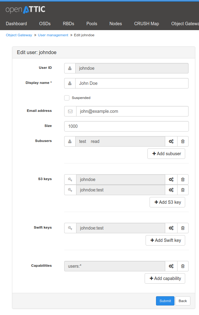 Similar to the iSCSI work, this feature consists of two separate tasks. On the one hand, we needed to establish a connection from openATTIC to the RGW Admin Ops API, which is developed by Patrick Nawracay and tracked in OP-1612 (PR#72).